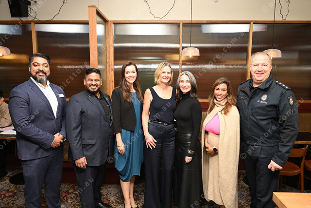 Pic of mayor Cr Pradeep Tiwari, Goro Gupta, Suzanne Paynter, organiser Amanda Thompson, Michelle Sexton, Dr Emma Fulu, and Inspector Dale Huntington, Victoria Police. (Damjan Janevski).