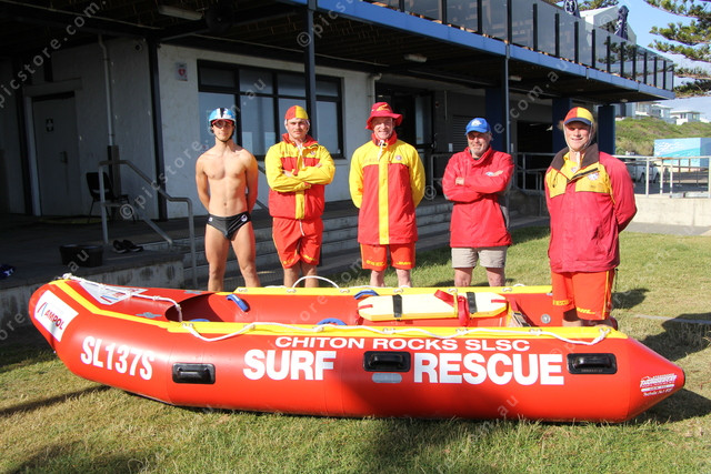 Chiton Rocks Surf Lifesaving members Finn Bezzina, Lucas Garlik, Damien Derlique, Club President Darren Hocking and Connor Irvin with the new Ampol IRB Hull rescue boat the club won in a competition. (Dee Elferink: 518247_01)