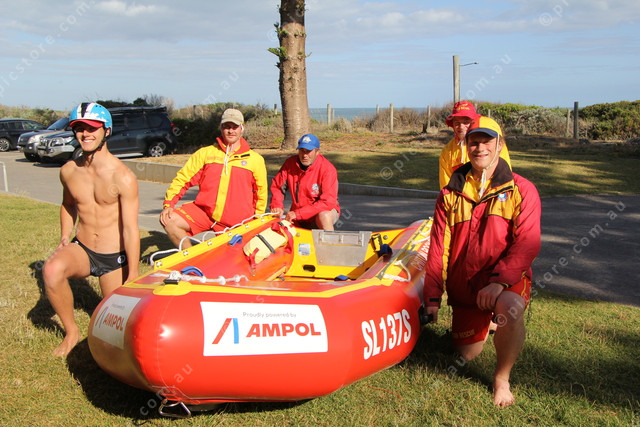 Chiton Rocks Surf Lifesaving members Finn Bezzina, Lucas Garlik, Club President Darren Hocking, Damien Derlique and Connor Irvin with the new Ampol IRB Hull rescue boat won in a competition. (Dee Elferink: 518247_02)