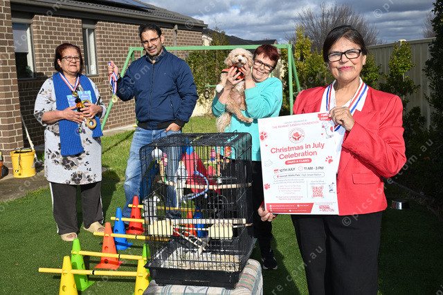 The Rehmat Sandhu Foundation are hosting a free community Christmas in July celebration. Pic of Ravinder Kaur (front), Shaheen Perwaze, Divijay Singh and Simone Holdsworth and her dog Penny. Photo by Damjan Janevski. 487978_05