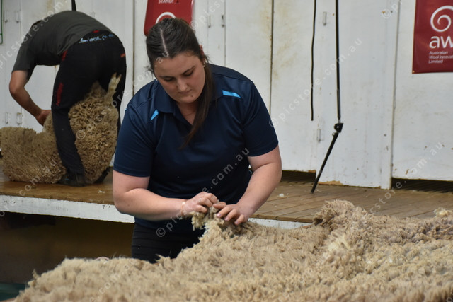 Hayley Brown skirts a fleece in the senior wool handling. (511568)