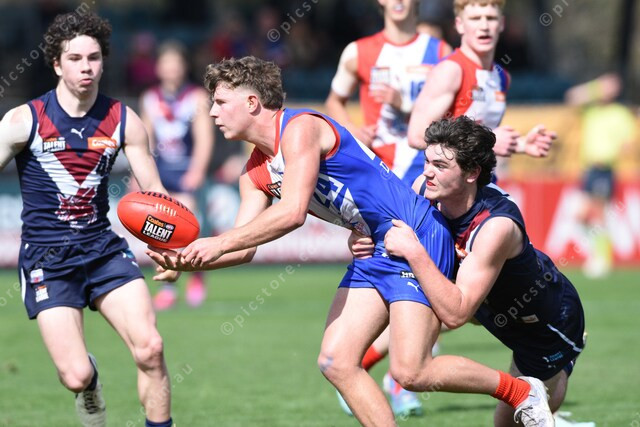 Brodie Atkins (24 Gippsland Power) with the ball. Pursued by Tyson Bradley (16 Sandringham). 503003_16