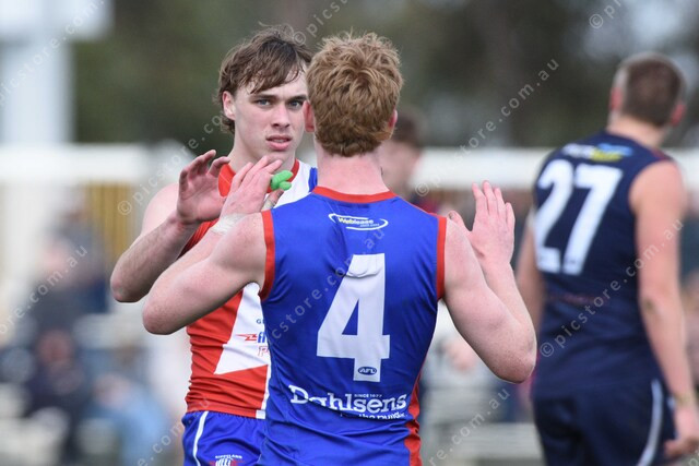 Judd Burgiel (6 Gippsland Power, left) after his goal. Teammate Zachary O’Keefe (4). 503003_17