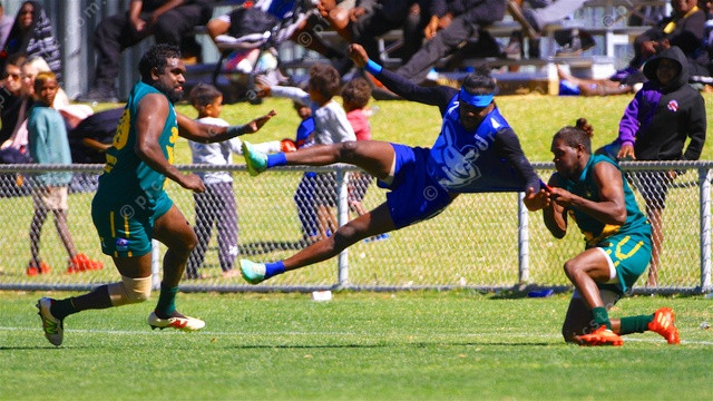 FLUNG: A Laramba player flies after being flung off the ball by a Papunya opponent. (PIC: PHIL WILLIAMS 495256_04