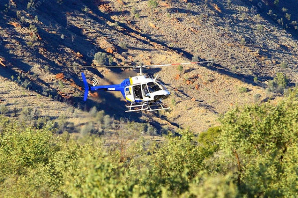SKIM: The helicopter skims the tree tops as it flies low over the search area on Thursday. (PIC: PHIL WILLIAMS 493397_10)