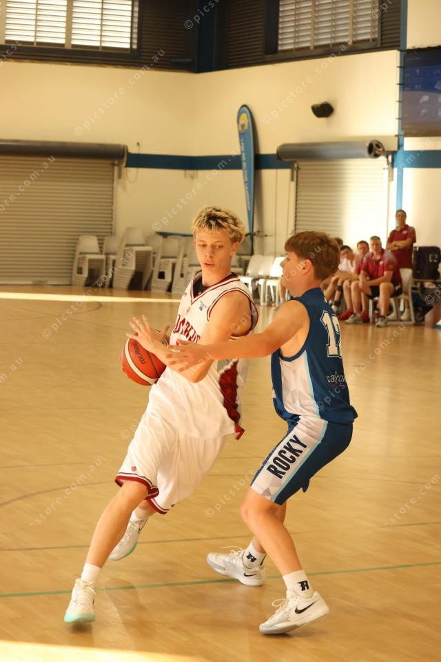 Bundaberg’s TeAmo Fowler drives to the rim past Rockhampton’s Fletcher Prince.
