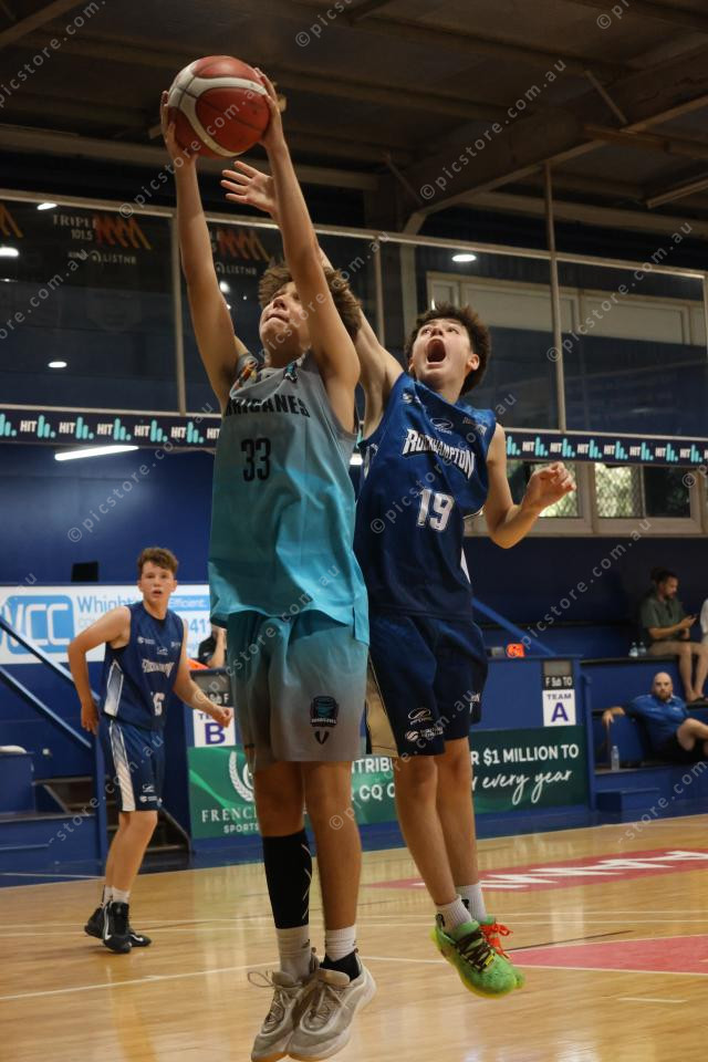 Hervey Bay’s Didier Bone and Rockhampton’s Anthony Nakhle jump for a rebound.