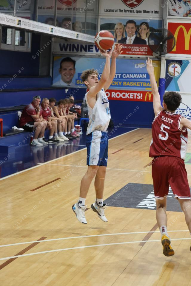 Jets’ Levi Ramm shoots over the defence of Bundaberg’s Joshua Slater.