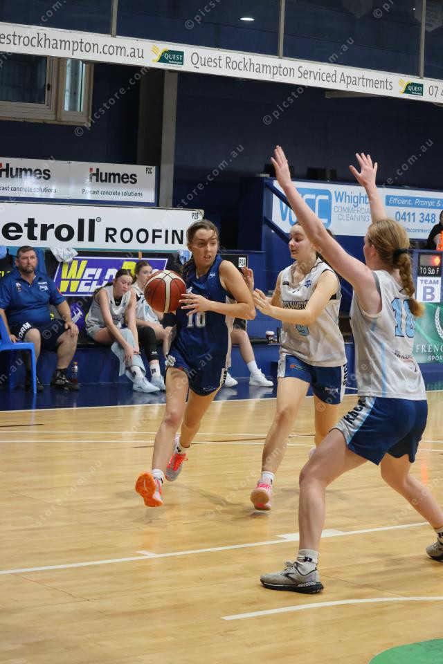 Cyclones’ Bre Walsh drives into the paint where Storm’s Michaela Simmons awaits with a contest.