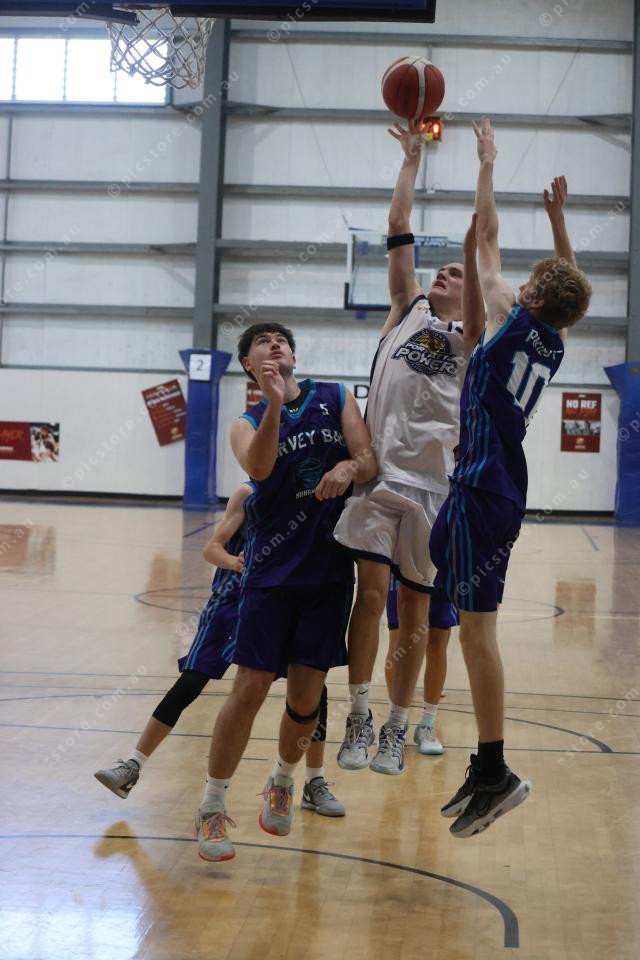 Gladstone’s Lucas Rhodes gets his shot off despite the tough Hervey Bay defence.