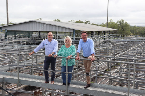 Regional Livestock Exchanges chief executive officer Brett Freer, MP Michelle Landry and Leader of the Nationals MP David Littleproud.