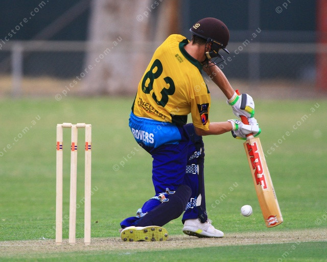 Lucas Nitschke mis-hits as he digs out a Singh delivery. (PIC: PHIL WILLIAMS 511314_02