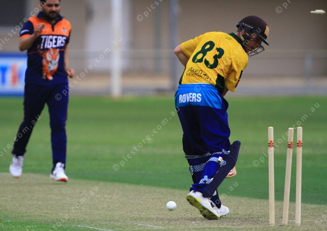 SHATTERED: Lucas Nitschke looks back to see that his stumps had been shattered by a Balpreet Singh delivery. (PIC: PHIL WILLIAMS 511314_05)