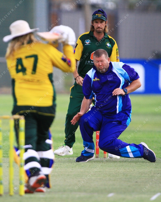 GRIMACE: Chris Rudd grimaces as he his hit by return shot off his own bowling. (PIC: PHIL WILLIAMS 466842_02)