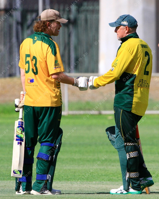 KEEP GOING: Connor Mullins and Mark Leembruggen touch gloves between innings. (PIC: WILLIAMS 466842_05)