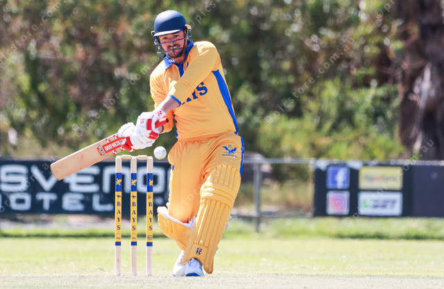 Encounter Bay batsman Sunny Osmond plays a crunching shot to leg side on his way to 46. (Jesse Ehlers 511629_01)