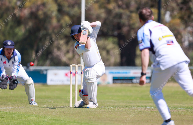 Mount Compass batsman Ethan Anderson hits a cover drive against Victor Harbor. (Jesse Ehlers 511629_07)