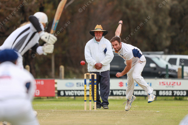 Encounter Bay bowler Lachlan Barrett sends the ball down the pitch to the Goolwa batter. (Jesse Ehlers: 521327_13)