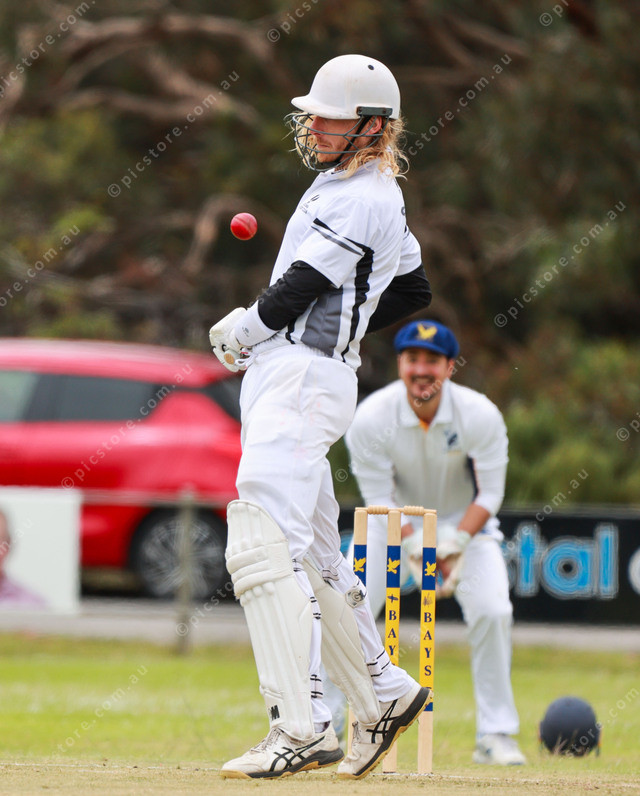 Goolwa batter Josh Jones dodges a high ball sent to him by the Encounter Bay bowler. (Jesse Ehlers: 521327_18)