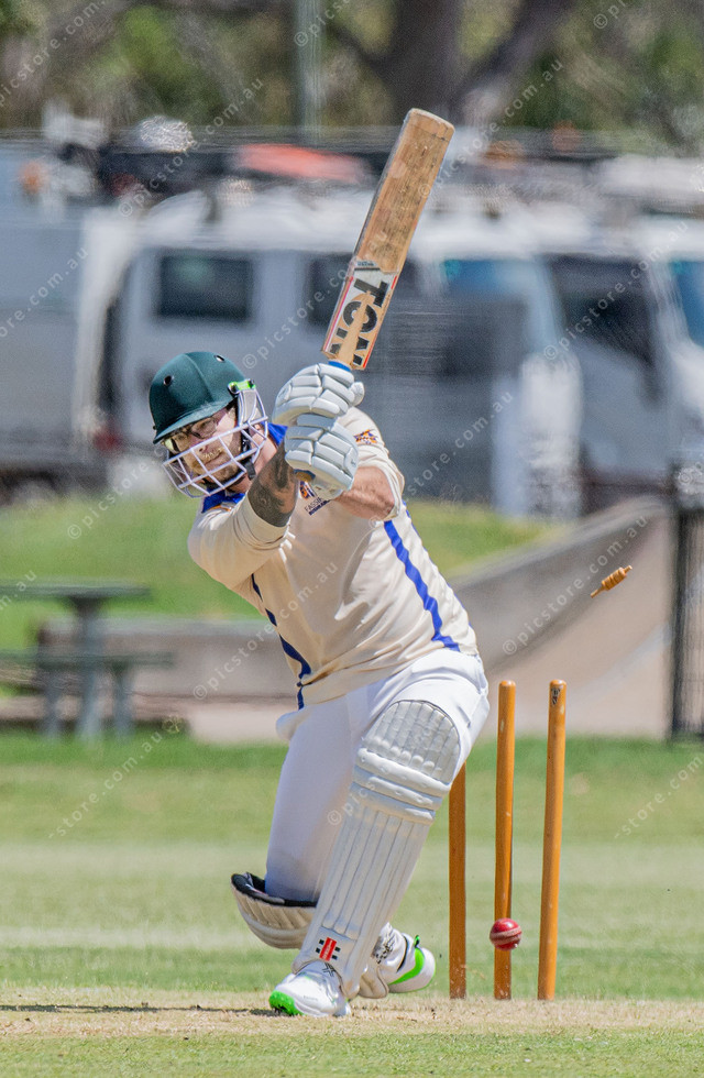 Lachlan Andrews (c), batting for the Fassifern Bushrangers bowled out.