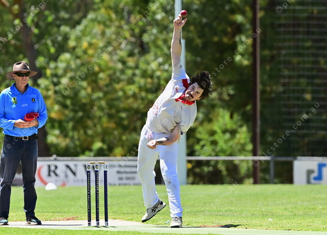 Matthew Harris puts his all into this delivery for Strathalbyn. (Jesse Ehlers 534968_02)