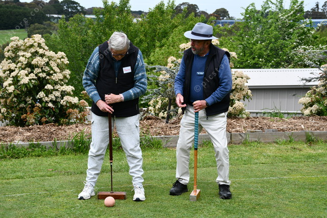 From left, Jenny Reynolds, and teacher Tim O’Brien chat croquet skills.