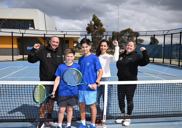 Caroline Springs Tennis Club received a volunteers grant from the state government. Pic of(L-R): head coach Chris Singh, Xavier (12), Jonah (14); Maria Fraietta (vice president) and Sherridan Long (Itennis Coaching Academy). (Damjan Janevski). 502920_03