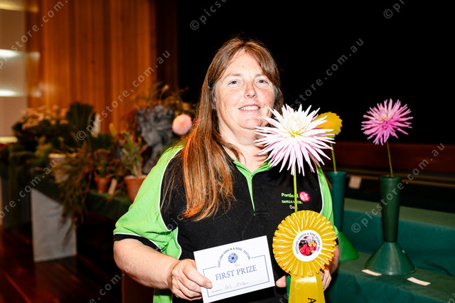 464279_02 (Deb Aitken, of Portland, who was awarded the Alf Hardingham Memorial Challenge flower award for her cactus dahlia titled ‘Jan Lennon’ – a novice section entry. “I got such a surprise that I won,” she said.