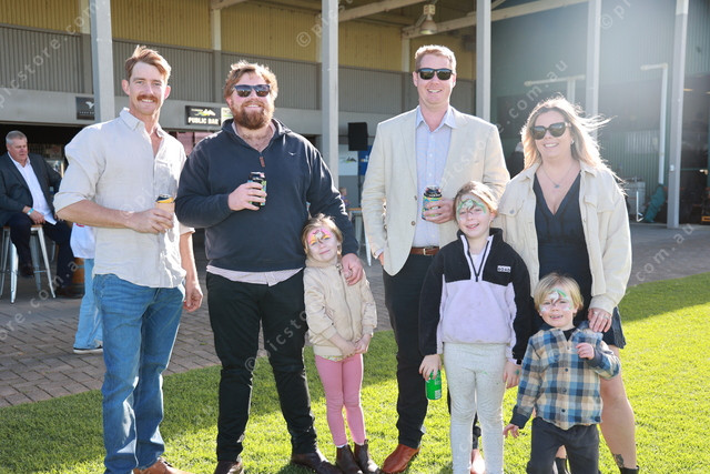 Matt King, James Hammond, Quinn Jonny, Emily Hammond, Amelia Hammond, Zaylee Hammond and Luca Hammond watching the races at the Daish Irigation Family and Fodder Race Day. 479185_08
