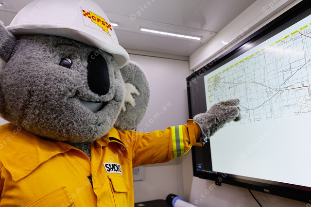 Smokey checks out the map in the Region 2 mobile operations command unit. (511831_04)