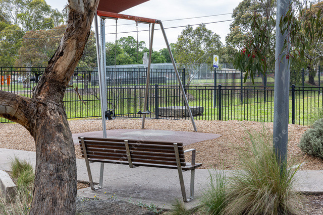 Inside Red Gum Rest playground looking out to where the missing fence area is although the playground itself has no gaps in the fence.