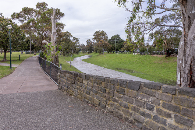 Next to the entrance of the blue bridge at Dandenong Park the opposite side to the high fence is a low fence and low wall.