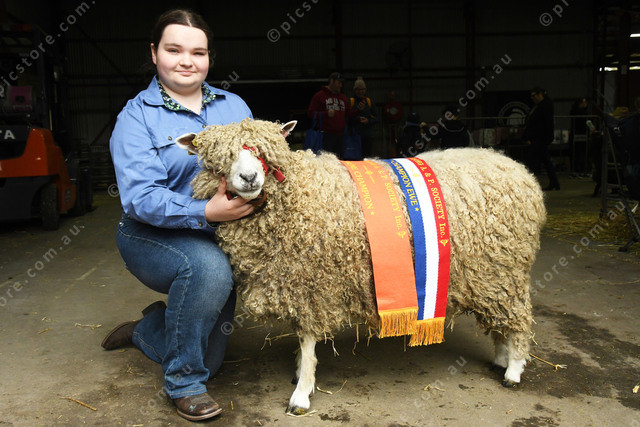 Steph Robinson with Champion English Leicester Ewe and Supreme Champion English Leicester from Kiah Kilibinbin Stud in Bainsdale 514743_12
