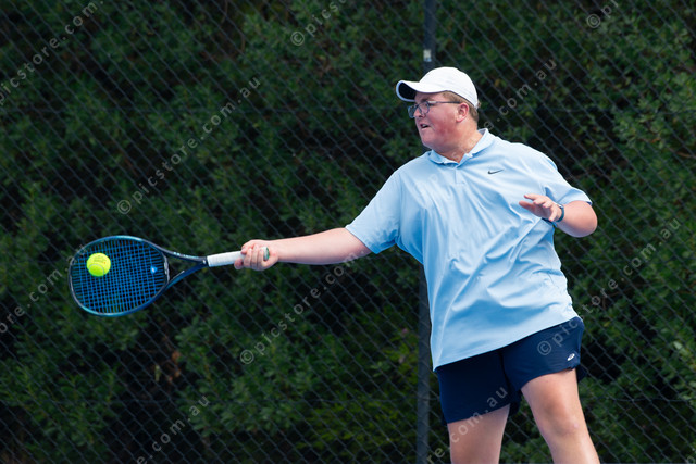 Victor Harbor’s Jack Prosser whacks the ball back during his division one singles match. (Dani Brown: 536274_03)