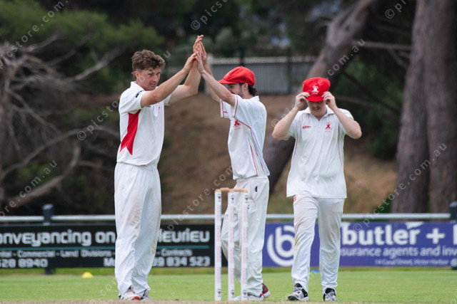 Eddie Last, left, celebrates taking the wicket of Lachlan Hywood in A grade cricket on Saturday. (Dani Brown: 536274_05)