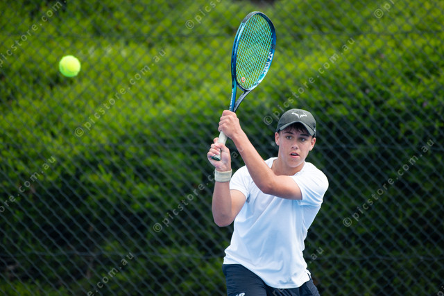 Port Elliot division one singles player Axel Bowles whacks the ball back during his match on Saturday. (Dani Brown: 536274_10)