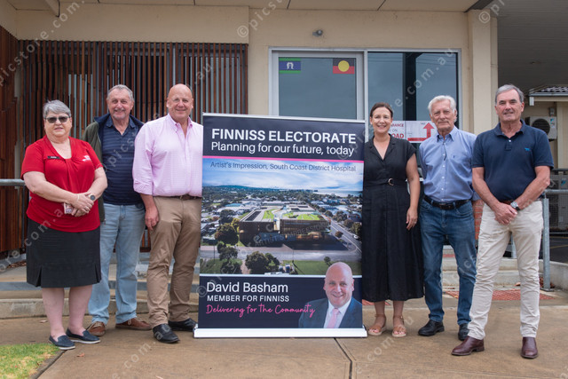 Victor Harbor Private Hospital’s Julie Irwin, Victor Harbor local Philip Shaw, Member for Finniss David Basham, Shadow Minister for Health Heidi Girolamo, and Victor Harbor Private Hospital’s Clive Fowler and Phil Goode. (Dani Brown: 535527_01)