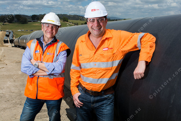 Melbourne Water project manager Victor Gilevitis and John Holland project manager Adam Gorny at the aqueduct site. 162980 Picture: Jesse Graham