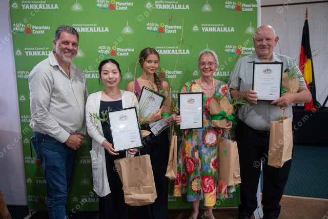 Mayor Darryl Houston congratulates four of the Yankalilla districts new citizens. (Dani Brown: 530962_07)