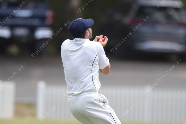 Jake Hancock (Berwick) catches a ball from batsman Shaun Weir (Dandenong West). 451357_13