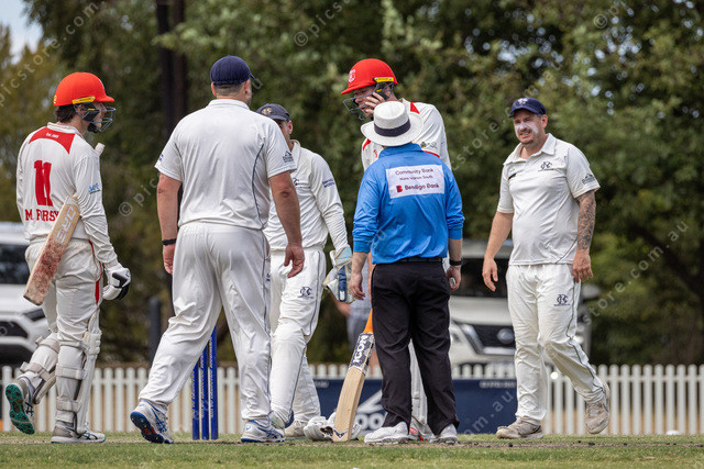 N. Boland takes a break while the umpires check for damage on the helmet.