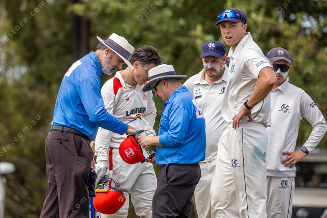 N. Boland takes a break while the umpires check for damage on the helmet.