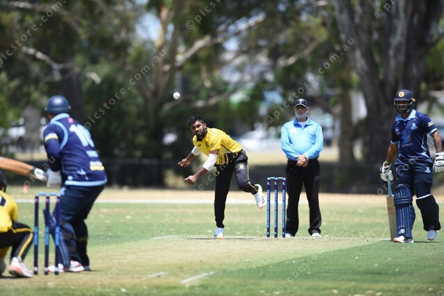 Ashan Madhushanka Walgamage (Beaconsfield) bowls to Dale Tormey (Buckley Ridges). 527662_04