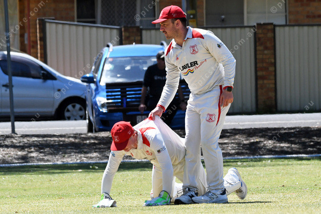 Springvale South wicket keeper Christopher Diston is helped up by Ryan Quirk 535990_16