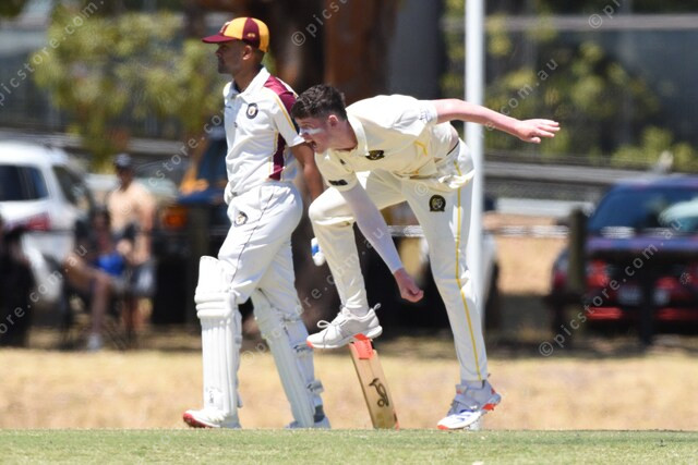 Alex Nice (Beaconsfield) bowls to Shaun Weir (Dandenong West). batsman watching is Nipunaka Fonseka (Dandenong West). 530014_04