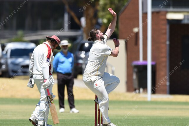 Jake Cutting (Beaconsfield) bowls to Nipunaka Fonseka (Dandenong West). batsman watching is Shaun Weir (Dandenong West). 530014_08