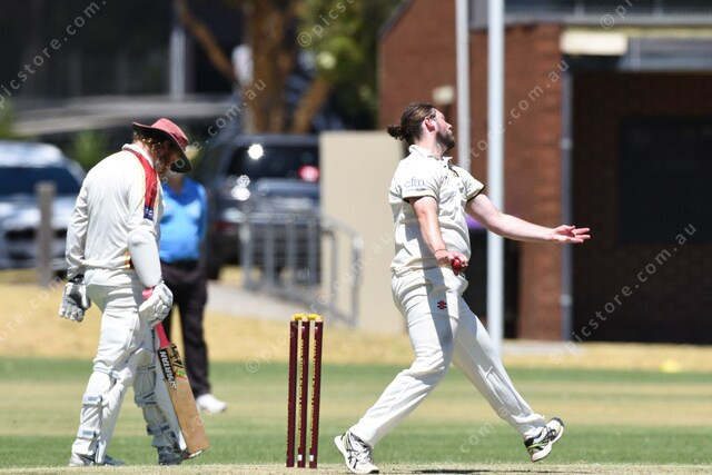 Jake Cutting (Beaconsfield) bowls to Nipunaka Fonseka (Dandenong West). batsman watching is Shaun Weir (Dandenong West). 530014_09