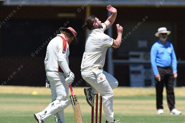 Jake Cutting (Beaconsfield) bowls to Nipunaka Fonseka (Dandenong West). batsman watching is Shaun Weir (Dandenong West). 530014_10