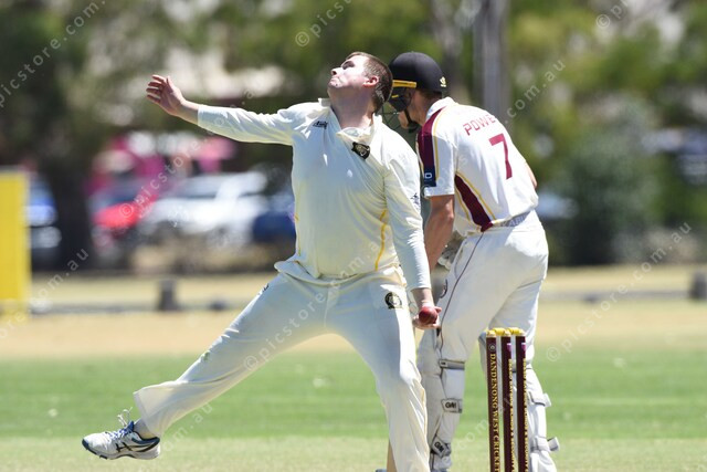 Mitchell Tielen (Beaconsfield) bowls to Riley Siwes (Dandenong West). batsman watching is Nathan Power (Dandenong West). 530014_28