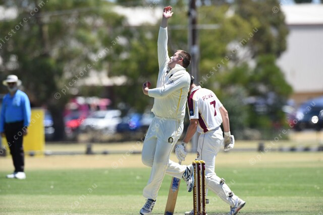 Mitchell Tielen (Beaconsfield) bowls to Riley Siwes (Dandenong West). batsman watching is Nathan Power (Dandenong West). 530014_29